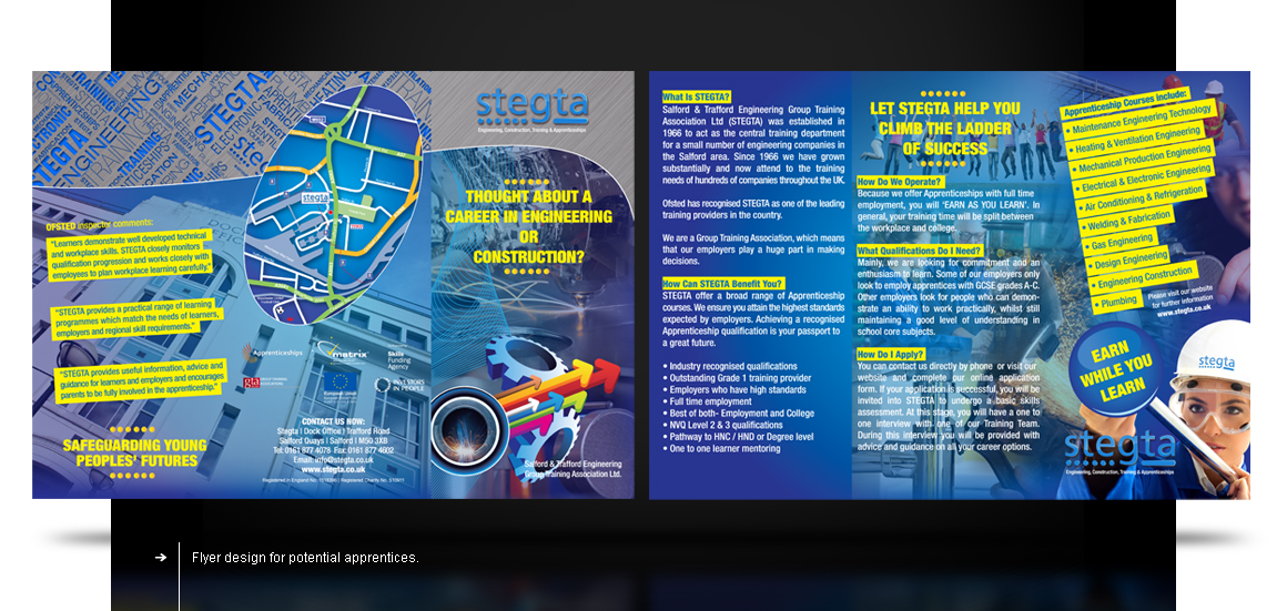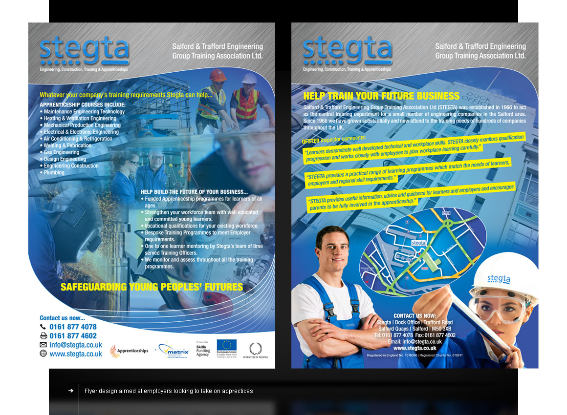 This well established apprentice training company came to us to modernise their entire image. This has consisted of every graphic detail, from logo design to all the print and marketing collateral, related to their company. This material was so well received that we gained the contract to design, develop and maintain their new website. Below are examples of this work.